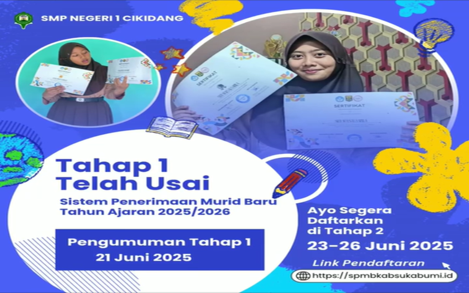 SMP Negeri 1 Cikidang kembali membuka kesempatan bagi calon peserta didik baru melalui Sistem Penerimaan Murid Baru (SPMB) Tahap 2 Jalur Domisili. Bagi masyarakat yang berdomisili di se